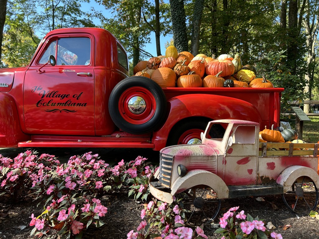 The bed of the truck is often packed full of bright annual flowers, and pumpkins in the fall.